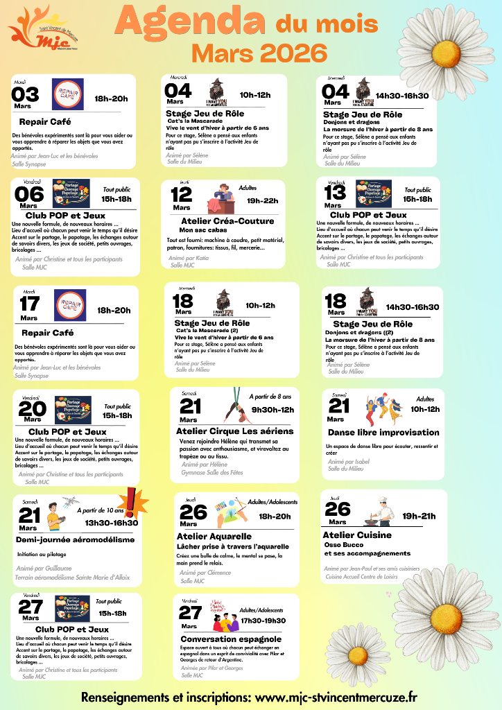 Aïkido, Capoeira, Cirque, Conversation anglaise, Couture, Dessin peinture, Guitare, Gym.Senior+, Hip-hop, Jeux de rôle, Peinture atelier libre, Pilates, Qi Gong, Renfo cardio musculaire, Stretching, Théâtre, Yoga...